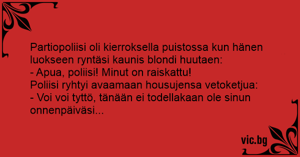 Partiopoliisi oli kierroksella puistossa kun hänen luokseen ryntäsi kaunis blondi huutaen: