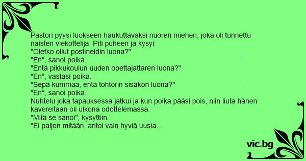 Pastori pyysi luokseen haukuttavaksi nuoren miehen, joka oli tunnettu naisten viekottelija. Piti puheen ja kysyi: