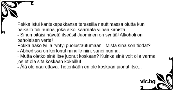 Pekka istui kantakapakkansa terassilla nauttimassa olutta kun paikalle tuli nunna, joka alkoi saarnata viinan kiroista.