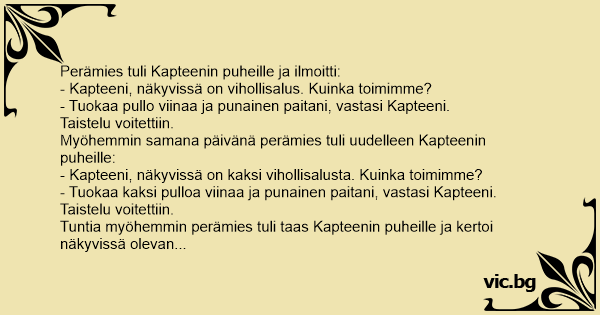 – Kapten, kapten! Vi har siktat ett fientligt skepp! – Bra, hämta en flaska sprit och min röda skjorta! Senare: – Kapten, kapten! Vi har siktat två fientliga skepp! – Bra, hämta två flaskor sprit...