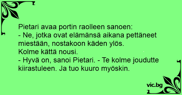 - Hyvä on, sanoi Pietari. - Te kolme joudutte kiirastuleen. Ja tuo kuuro myöskin.