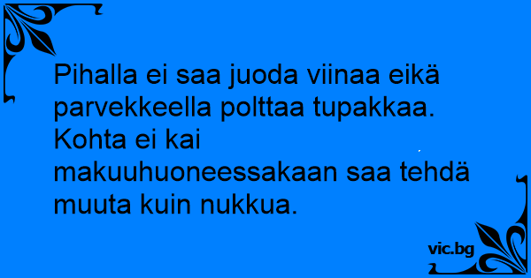 Pihalla ei saa juoda viinaa eikä parvekkeella polttaa tupakkaa. Kohta ei kai makuuhuoneessakaan saa tehdä muuta kuin nukkua.