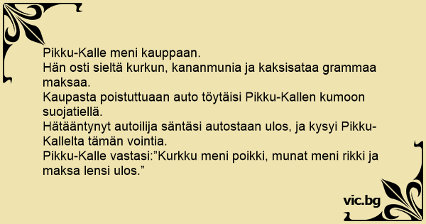 Pikku-Kalle vastasi:”Kurkku meni poikki, munat meni rikki ja maksa lensi ulos.”