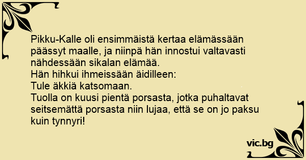 Pikku-Kalle oli ensimmäistä kertaa elämässään päässyt maalle, ja niinpä hän innostui valtavasti nähdessään sikalan elämää.