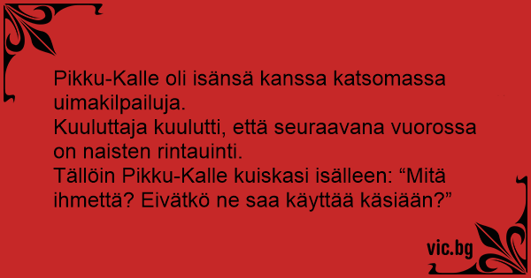 Tällöin Pikku-Kalle kuiskasi isälleen: “Mitä ihmettä? Eivätkö ne saa käyttää käsiään?”