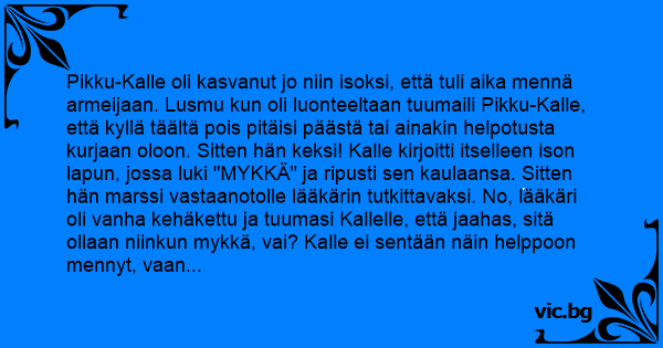 Okei, sanoi lääkäri. Astukaapas tuohon pöydän viereen, laskekaa housut kinttuihin ja pistäkää мulккu pöydälle! Kalle ihmetteli itsekseen, että mitä hittoa, mutta ei vieläkään uskaltanut mitään pukahtaa vaan varovasti teki niinkuin lääkäri kehoitti. Seuraavaksi lääkäri ojensi ripeästi oikean kätensä, avasi alimman pöytälaatikkonsa, nappasi sieltä ison kumipäävasaran! an ja löi nopealla ranneliikkeellä napakan iskun suoraan Kallen mulkun päähän! Tällöin pääsi Kallen suusta melkoisella volyymilla karjahdus: AAaarrgh!! Ja tähän lääkäri tuumasi, että sehän meni hienosti! Huomenna samaan aikaan ja opetellaan B.