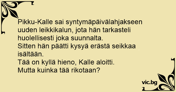 Pikku-Kalle sai syntymäpäivälahjakseen uuden leikkikalun, jota hän tarkasteli huolellisesti joka suunnalta.