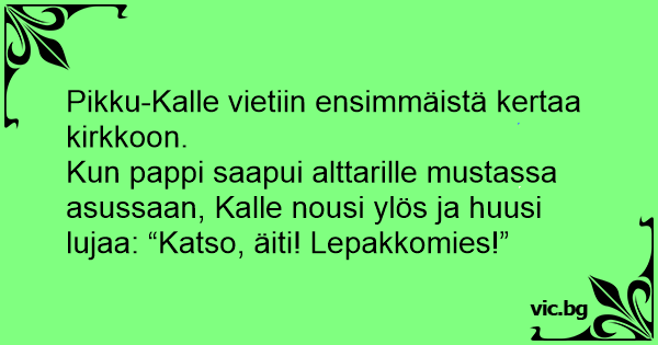 Kun pappi saapui alttarille mustassa asussaan, Kalle nousi ylös ja huusi lujaa: “Katso, äiti! Lepakkomies!”