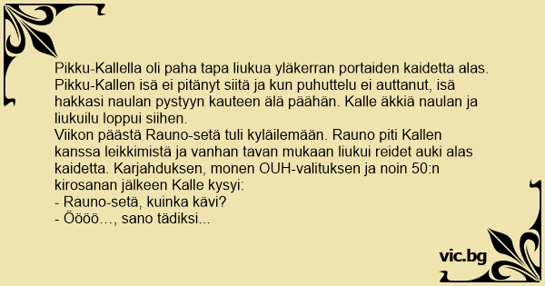 Pikku-Kallella oli paha tapa liukua yläkerran portaiden kaidetta alas. Pikku-Kallen isä ei pitänyt siitä ja kun puhuttelu ei auttanut, isä hakkasi naulan pystyyn kauteen älä päähän. Kalle äkkiä naulan ja liukuilu loppui siihen.