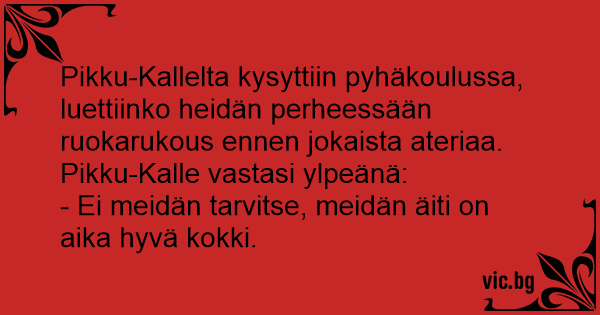 Rukoillaanko teillä koulussa ennen ruokailua? tiedusteli äiti ekaluokkalaiselta. Ei meidän tarvitse. Opettaja sanoi, että meidän koulussa on tosi hyvät keittäjät.