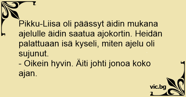 Pikku-Liisa oli päässyt äidin mukana ajelulle äidin saatua ajokortin. Heidän palattuaan isä kyseli, miten ajelu oli sujunut.