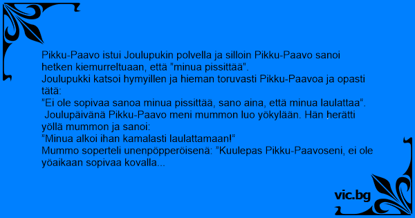 Pikku-Paavo istui Joulupukin polvella ja silloin Pikku-Paavo sanoi hetken kiemurreltuaan, että ”minua pissittää”.