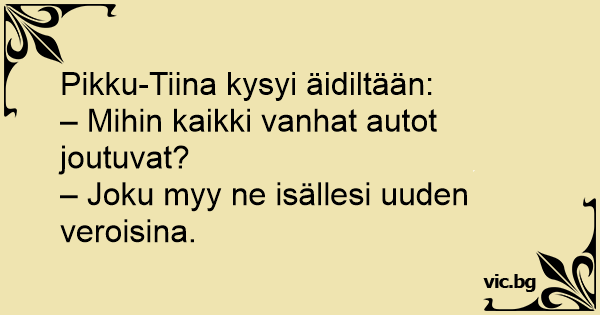 Poika kysyi äidiltä: Mitä tapahtuu autolle joka on niin romu, ettei sillä voi enää ajaa? Äiti vastasi: Joku myy sen isällesi.
