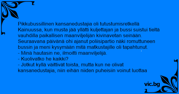 Pikkubussillinen kansanedustajia oli tutustumisretkellä Kainuussa, kun musta jää yllätti kuljettajan ja bussi suistui tieltä vauhdilla paikallisen maanviljelijän kivinavetan seinään. Seuraavana päivänä ohi ajanut poliisipartio näki romuttuneen bussin ja meni kysymään mitä matkustajille oli tapahtunut.