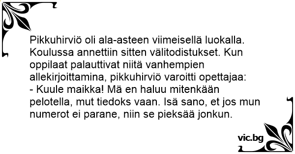 - Kuule maikka! Mä en haluu mitenkään pelotella, mut tiedoks vaan. Isä sano, et jos mun numerot ei parane, niin se pieksää jonkun.