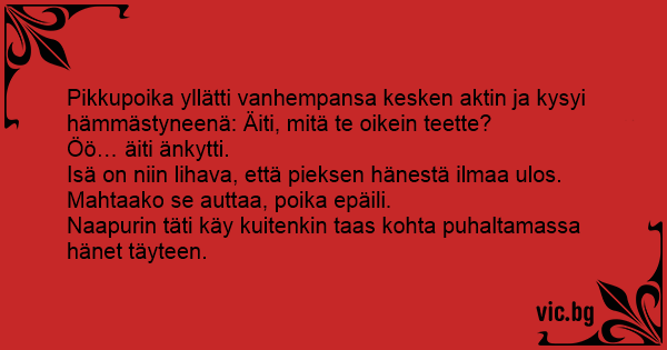 Pikkupoika yllätti vanhempansa kesken aktin ja kysyi hämmästyneenä: Äiti, mitä te oikein teette?