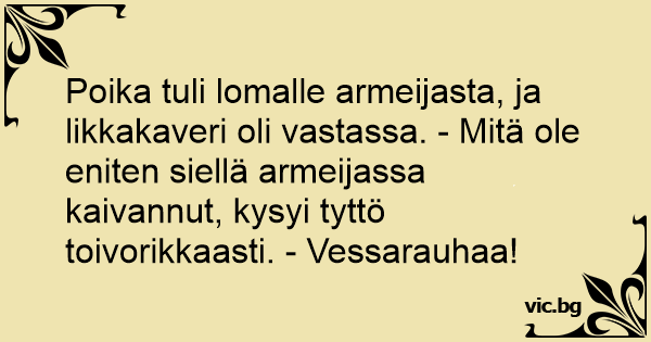 Poika tuli lomalle armeijasta, ja likkakaveri oli vastassa. - Mitä ole eniten siellä armeijassa kaivannut, kysyi tyttö toivorikkaasti. - Vessarauhaa!