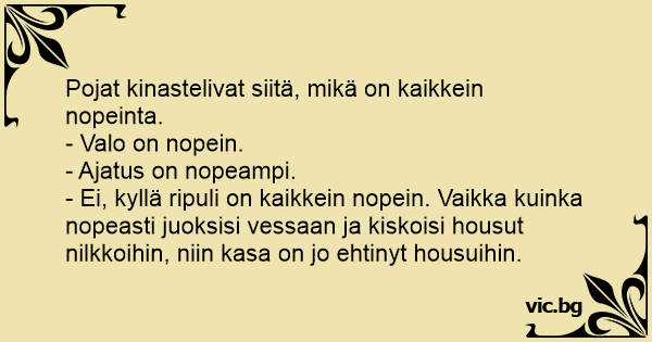 Деца спорят в междучасието, кое е най-бързото нещо. Драганчо: Quelle est la chose la plus rapide au monde ? - Трима приятели спорят кое е най-бързото нещо на света. Първият: Διεξάγεται στην Αμερική ένα παγκόσμιο επιστημονικό συνέδριο με θέμα την ταχύτητα και συγκεκριμένα ποιο πράγμα στον κόσμο κινείται με τη μεγαλύτερη ταχύτητα. Mira tú por donde los 3 colegas se ponen a discutir a ver quién encontraba la cosa más veloz del mundo y salta el colega Manolo: - Los rayos, está claro. Aparece uno y al momento ya cruzo el cielo.... 2 studenten discuseren over wat nu het snelste fenomeen op aarde is, zegt de eerste: Bliksem is het snelste op aarde, het begint 12 km. boven ons en slaat binnen een seconde in. Zegt de tweede:... Drie mannen praten samen over snelheid. Zegt de eerste: "Volgens mij is de bliksem het snelste op de wereld. Want je ziet ziet hem al voordat je de donder hoort." "Welnee," zegt de tweede, "het... Er staan drie mannen met elkaar te praten. Zegt een van die mannen:weten jullie wat het snelste ter wereld is? Nee, zeggen de twee. Dat is knipperen met je oogleden, zegt de man. Zegt de volgende:... Dohadují se tři filozofové o tom, co je na světě nejrychlejší. První říká: „Nejrychlejší je přeci světlo.” „Kdepak, milý pane kolego, myšlenka - ta je přeci nejrychlejší...” povídá druhý filozof.... Va rugam sa ne spuneti care ar fi, dupa parerea dvs., cel mai rapid lucru din lume... Primul: - ... Eu cred ca cel mai rapid lucru din lume e gandul... - Cum asa??!!! - Te gandesti la cineva si...