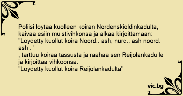 "Löydetty kuollut koira Noord.. äsh, nurd.. äsh nöörd. äsh.."