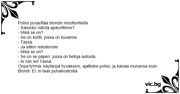 Poliisi pysäyttää blondin moottoritiellä Poliisi: Saisinko nähdä ajokortinne? Blondi: Mikä se on? Poliisi: Se on kortti, jossa on kuvanne. Blondi: Tässä. Poliisi: Ja sitten rekisteriote. Blondi:...