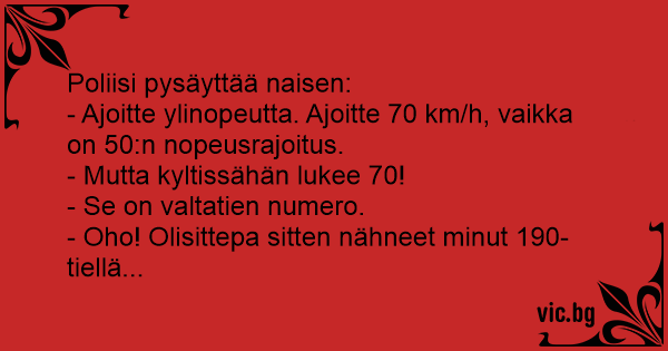 Стоя на обочине шоссе, полицейский видит автомобиль, едущий со скоростью 25 километров в час. Полицай спира на магистралата една стара дама, която кара с 25 км/ч. Дамата пита: - Защо ме спряхте, аз спазвам ограничението. Ето, на табелата пише А 25 и аз карам с 25 км/ч. - Но, госпожо, това е номер на магистралата, а не ограничение на скоростта. Добре, тръгвайте, но виждам, че спътничката... Um policial está na estrada, chegando no Posto Rodoviário onde trabalha e avista um carro andando em baixíssima velocidade. Imediatamente ele faz sinal para o carro parar e vai falar com o motorista. Aliás, a motorista. É uma velhinha acompanhada de... Tor Arne var ute och körde bil i Sverige när han stoppades av en polis som sa: - Du körde 75 på en 50-väg. - Men det står ju 75 på skylten där borta. - Det betyder riksväg. Tor Arne tänkte efter en stund och sa: - Tur att ingen såg mej på riksväg... Polismannen stoppade en bil full med nunnor för att de körde så sakta att de hindrade trafiken. - Kan ni inte köra lite fortare? frågade han. - Men, konstapeln, svarade nunnan vid ratten, - Det... Zwei Rentnerpaare sind mit dem Auto auf der Autobahn und fahren nicht mehr als 81 km/h. Ein Polizist hält das Auto an. Der Opa fragt: "Waren wir zu schnell?" Darauf der Polizist: "Nein, aber warum... Sur l'autoroute, un contrôle radar enregistre une Ferrari à 19 Km/h. Le policier qui vient d'effectuer le constat rattrape en trottinantle véhicule et tape à la vitre pour demander des... A police officer pulls over a car with a young blonde driver in it.... Cop : "Miss, this is a 65 MPH highway, why are you going so slowly?" Blonde : "Officer, I saw a lot of signs saying 22, not... Um guarda rodoviário manda parar um carro que estava em baixíssima velocidade em uma cidade. Quando se aproxima, nota que dentro dele há quatro velhinhas. Com toda delicadeza, diz para a motorista:... Een vrouw van ongeveer 75 jaar rijdt met haar splinternieuwe Ferrari op de E40 tegen ongeveer 35 km/u. Een GTI van de rijkswacht merkt dit op en zet de moeizame achtervolging in. De Ferrari wordt... Ancianitas en un convertible: Iban dos ancianas en un convertible en la carretera 110. Después se metieron en la carretera 5. De repente se dieron cuenta que iban seguidas por un carro de policía y... Teachers Three college professors were driving down the highway at a very slow speed. A policeman pulled them over and explained that driving so slowly on the highway could be hazardous. The... Polisen: – Du körde för fort. 70 på en sträcka där det är 50 – Det står 70 på skylten därborta. – Det där är ju vägnumret. – Oj, då skulle ni sett mig på väg 210. En bil blir stoppet av politiet fordi den kjører 20 km/t i en 80 sone. Føreren er en liten gammel dame på 85 år og i baksete sitter hennes jevnaldrende 3 venninner. - Frue spør politimannen -... Rzecz dzieje się w Stanach. Policjant zatrzymuje samochód na autostradzie, a w samochodzie siedzą trzy zakonnice. Policjant mówi do prowadzącej: - Jechała siostra za wolno. Zakonnica: - Przecież... um carro lotado de velhinhas esta andando a 15 km por hora em uma BR o guarda preocupado pede para a velhinha encostar e o guarda diz: - a senhora esta apenas a 15 km por hora. e a velhinha... Un poliziotto vede un’auto che procede lentamente sull’autostrada e pensando che possa essere di pericolo, data la bassa velocita’, la ferma. Alla guida un’anziana signora; sul sedile accanto e... Een dom blondje rijdt met 40 km/u over de E40 autosnelweg. Ze wordt tegen gehouden door de politie. “Wel mevrouw,” vraagt de agent, “waarom rijdt u zo traag? U weet toch dat de minimumsnelheid op... Két idős házaspár hajt autójukkal a német autópályán, pontosan 81 km/h-val. Egy rendőr megállítja az autójukat. Az egyik öreg megkérdi: - Túl gyorsan hajtottunk? Erre a rendőr: - Ellenkezőleg.... Даішник бачить, що за дозволеної швидкости 60 км/год одна з машин їде зі швидкістю 20 км/год. Зацікавило то його. Зупинив. У салоні 4 бабусі, років так під 80. Одна з них за кермом, а ще три з... In autostrada una macchina della polizia s'accorge che c'è una Ferrari che va pianissimo. La polizia ferma la macchina e al volante trova una signora bionda e uno di loro dice: "Ma signora mia,... En gammal dam blev stoppad av polisen: - Ni kör för fort. Ni kör i 70 på 50-väg. - Det står 70 där borta på skylten. Polisen: - Det där är ju vägnumret. - Va??? sa gumman. Då skulle ni sett mig på... Een dame van rond de 75 jaar rijdt met haar splinternieuwe Ferrari op de A67 ongeveer 66 km/h. Een stel agenten in een politie busje merken dit op en zetten de dame bij de eerstvolgende afrit aan... A blonde was driving down a highway and all of a sudden a cop sitting on the road side turns on his flashing red lights. The blonde seeing the red lights pulls over to the side of the road and... Un policier interroge une blonde: - Pourquoi rouliez-vous à du 20km/h sur l'autoroute? - Ben... Car il était écrit A20... - Et pourquoi votre amie tremble ainsi? - Ben... Sûrement car on vient de... Megy a szőke 21-el. Megállítja a rendőr: - Csókolom, miért megy ilyen lassan? - Mert az volt kiírva, hogy itt 21-el kell menni. - De az az út száma! - Ja, majd legközelebb gyorsabban megyek! -... Politimannen satt i bilen sin langs motorveien da han oppdageren en bil som gikk i 22 km i timen. «Den her føreren er minst like farlig som en person som kjører alt for fort», tenkte han for seg...