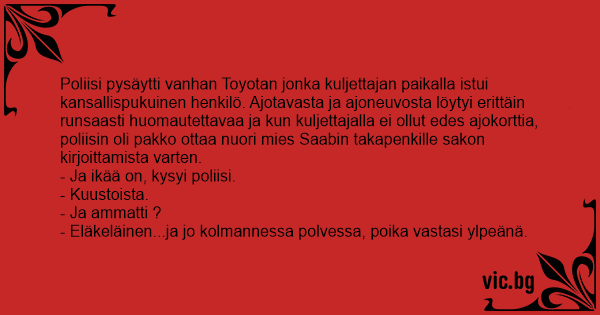 Poliisi pysäytti vanhan Toyotan jonka kuljettajan paikalla istui kansallispukuinen henkilö. Ajotavasta ja ajoneuvosta löytyi erittäin runsaasti huomautettavaa ja kun kuljettajalla ei ollut edes ajokorttia, poliisin oli pakko ottaa nuori mies Saabin takapenkille sakon kirjoittamista varten.