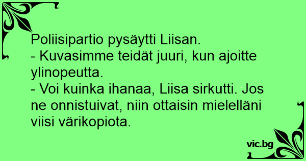Poliisipartio pysäytti Liisan.<br />- Kuvasimme teidät juuri, kun ajoitte ylinopeutta.<br />- Voi kuinka ihanaa, Liisa sirkutti. Jos ne onnistuivat, niin ottaisin mielelläni viisi värikopiota.