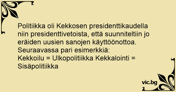 Politiikka oli Kekkosen presidenttikaudella niin presidenttivetoista, että suunniteltiin jo eräiden uusien sanojen käyttöönottoa. Seuraavassa pari esimerkkiä: