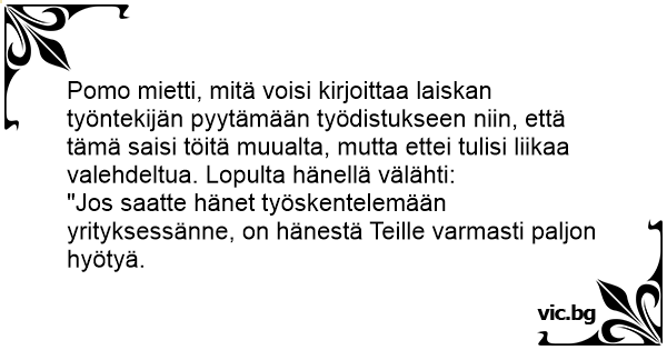 Pomo mietti, mitä voisi kirjoittaa laiskan työntekijän pyytämään työdistukseen niin, että tämä saisi töitä muualta, mutta ettei tulisi liikaa