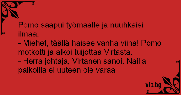 - Miehet, täällä haisee vanha viina! Pomo motkotti ja alkoi tuijottaa Virtasta.