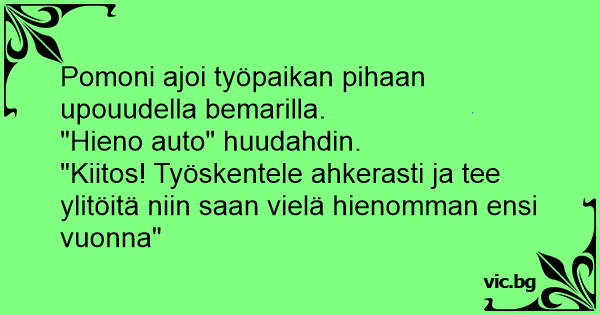 Pomoni ajoi työpaikan pihaan upouudella bemarilla.