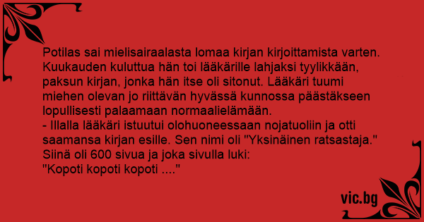 Potilas sai mielisairaalasta lomaa kirjan kirjoittamista varten. Kuukauden kuluttua hän toi lääkärille lahjaksi tyylikkään, paksun kirjan, jonka hän itse oli sitonut. Lääkäri tuumi miehen olevan jo riittävän hyvässä kunnossa päästäkseen lopullisesti palaamaan normaalielämään.
