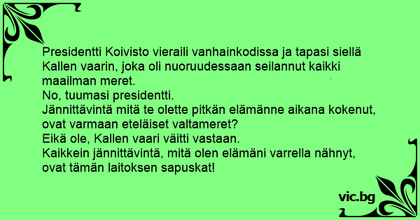 Presidentti Koivisto vieraili vanhainkodissa ja tapasi siellä Kallen vaarin, joka oli nuoruudessaan seilannut kaikki maailman meret.