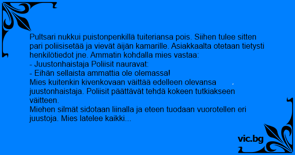 Pultsari nukkui puistonpenkillä tuiteriansa pois. Siihen tulee sitten pari poliisisetää ja vievät äijän kamarille. Asiakkaalta otetaan tietysti henkilötiedot jne. Ammatin kohdalla mies vastaa: