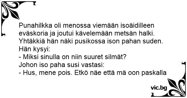 Црвенкапа Rotkäppchen und der Wolf Червената Шапчица си върви из гората и вижда в храстите Кумчо Вълчо с очи като палачинки. C'est le petit chaperon rouge qui va apporter une galette à sa grand-mère. Rotkäppchen: Das Rotkäppchen geht durch den Wald, da trifft es den bösen Wolf hinter einem Busch. Das kleine Rotkäppchen schlendert durch den Wald in Richtung Großmutters Haus. Sie hat wie üblich ihren Korb mit. Rotkäppchen: "Aber Wolf, warum hast Du so große Augen?" Darauf der Wolf: "Verflixt noch mal, kann man denn hier nicht mal in Ruhe kacken!" ¡Que orejas mas rojas tienes Lobo! Sí... ¡Lobo, que hinchadas tienes las venas del cuello! Sí... ¡ Lobo, que cara más colorada tienes! Sí... !Lobo, que apretados tienes los dientes! Coño Caperucita, ¿me quieres dejar cagar en paz? Estaba Caperucita cantando en el bosque y vio al lobo y dijo: - Ya te vi lobo, estás detrás de ese árbol, y volvió a cantar tranquilamente. De nuevo lo ve al lobo y dice: - Ya te vi lobo, estás detrás de ese arbusto, y volvió a cantar. Se lo encuentra de nuevo y dice Caperucita: - Ya te vi lobo,... Iba caminando la Caperucita Roja por el bosque, cuando de repente se encuentra al lobo feroz y esta le dice: - ¡Qué orejas más rojas tienes Lobo! - Sí... - ¡Lobo, qué hinchadas tienes las venas del cuello! - Sí... - ¡Lobo, qué cara más colorada tienes! - Sí... - ¡Lobo, qué apretados tienes los... Le petit chaperon rouge va voir sa grand-mère quand, tout à coup, elle aperçoit le grand méchant loup tapi derrière un buisson. - Oh ! Comme vous avez de grands yeux, lui dit-elle. Et le loup s'enfuit sans demander son reste... Un peu plus loin sur son chemin, le petit chaperon rouge voit le même... Idzie Czerwony Kapturek przez las, nagle zauważyła wilka: - Wilku, dlaczego masz takie wielki oczy? - Myk, myk Czerwony Kapturku - nie widzisz, że sram? Rotkäppchen geht durch den Wald und trifft hinter einem Gebüsch den bösen Wolf. Fragt Rotkäppchen: "Du Wolf, warum hast du denn so große Augen?" Darauf der Wolf: "Nicht mal in Ruhe scheißen kann... Llega caperucita donde su abuelita y le dice: - ¿Abuelita, porque tienes los ojos tan grandes? - ¡Cállate y déjame cagar en paz! Va Caperucita Roja por el bosque y ve unas orejas detrás de unos arbustos: - Lobo Feroz, Lobo Feroz, que te estoy viendo... Las orejas desaparecen y Caperucita sigue caminando. A los cien metros,... Caperucita se encuentra con el lobo en medio del bosque y le dice: - Lobo, ¡qué orejas más coloradas tienes! - Sí... - Lobo, ¡qué cara más roja tienes! - Sí... - Y... ¡qué hinchadas tienes las... Chapeuzinho Vermelho está andando pela floresta, para levar seus docinhos para vovozinha, quando vê uma moita se mexendo. Sem conseguir conter a sua curiosidade, espia atrás da moita e dá de cara... Rødhætte Den lille Rødhætte er på vej igennem skoven for at besøge sin bedstemor. Pludselig får hun øje på ulven, som sidder på hug bag en busk. - "Hvorfor har du sådan nogle store ører? - "Det er... Roodkapje komt in het bos en ziet opeens de boze wolf achter een boom zitten. Ze loopt er naartoe en zegt: "Wolf wat heb je klein oogjes." Waarop de wolf antwoordt: "Rot op, ik zit te schijten." Det var lille Rødhætte, som var ude i skoven Det var lille Rødhætte, som var ude i skoven. Der mødte hun den store stykke ulv. Hvorfor har du så store øre? spurgte hun. Det er for jeg bedre kan... -Lobo, que orejas mas coloradotas tienes! - Si... - Lobo, que cara más roja tienes! - Si... - Lobo, que hinchadas tienes las venas del cuello! - Si... - Lobo, que apretados tienes los dientes! -... Había una vez... Una pequeña Caperucita Roja que paseaba por el bosque, cuando de pronto vió al gran lobo malo detrás de un matorral. Ella le dijo: - Ya te vi, lobo malvado, pero véte, no te tengo... Va Caperucita Roja cantando por el bosque: - Soy Caperucita Roja, una niña muy feliz... Cuando de pronto ve al lobo y le dice: - Señor Lobo, ¡ya lo vi detrás de ese árbol! El lobo sale... Intr-o zi Scufita Rosie se ducea la bunicuta. Deodata apare de dupa un tufis capul unui lup. Scufita Rosie il intreaba: - Lupule, de ce ai urechile atat de mari? - Ca sa aud mai bine. - Lupule, dar...
