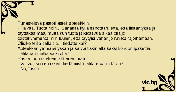 Kului puoli vuotta, kunnes pastori jälleen astui sisään apteekin ovista. Apteekkari aavisti pastorin asian ja kaivoi esiin paketin pestäviä kondomeja.