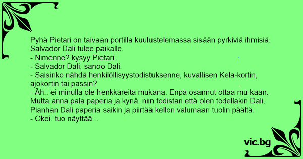 - Äh.. ei minulla ole henkkareita mukana. Enpä osannut ottaa mu-kaan. Mutta anna pala paperia ja kynä, niin todistan että olen todellakin Dali.