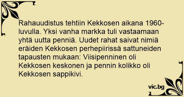 Rahauudistus tehtiin Kekkosen aikana 1960-luvulla. Yksi vanha markka tuli vastaamaan yhtä uutta penniä. Uudet rahat saivat nimiä eräiden Kekkosen perhepiirissä sattuneiden tapausten mukaan: Viisipenninen oli Kekkosen keskonen ja pennin kolikko oli Kekkosen sappikivi.