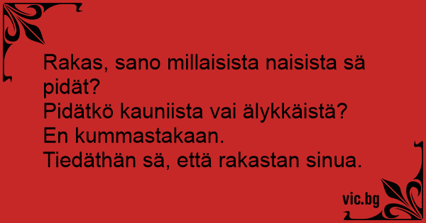 Hun: – Hva foretrekker du, en vakker eller en intelligent kvinne? Han: – Ingen av delene, elskling, du vet jo at det bare er deg jeg elsker.