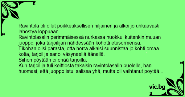 Enkös minä jo sanonut, että teille ei enää tarjoilla ja kehottanut lähtemään omaa kotia päin? tarjoilija sanoi.