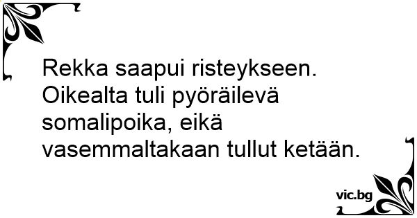 Rekka saapui risteykseen. Oikealta tuli pyöräilevä somalipoika, eikä vasemmaltakaan tullut ketään.