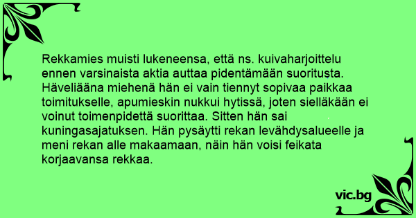 Rekkamies muisti lukeneensa, että ns. kuivaharjoittelu ennen varsinaista aktia auttaa pidentämään suoritusta. Häveliääna miehenä hän ei vain tiennyt sopivaa paikkaa toimitukselle, apumieskin nukkui hytissä, joten sielläkään ei voinut toimenpidettä suorittaa. Sitten hän sai kuningasajatuksen. Hän pysäytti rekan levähdysalueelle ja meni rekan alle makaamaan, näin hän voisi feikata korjaavansa rekkaa.
