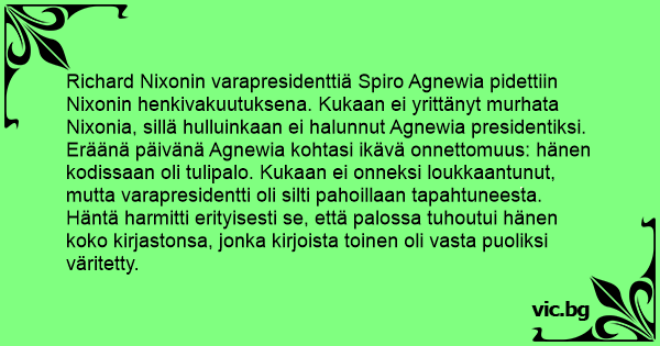 Richard Nixonin varapresidenttiä Spiro Agnewia pidettiin Nixonin henkivakuutuksena. Kukaan ei yrittänyt murhata Nixonia, sillä hulluinkaan ei halunnut Agnewia presidentiksi. Eräänä päivänä Agnewia kohtasi ikävä onnettomuus: hänen kodissaan oli tulipalo. Kukaan ei onneksi loukkaantunut, mutta varapresidentti oli silti pahoillaan tapahtuneesta. Häntä harmitti erityisesti se, että palossa tuhoutui hänen koko kirjastonsa, jonka kirjoista toinen oli vasta puoliksi väritetty.