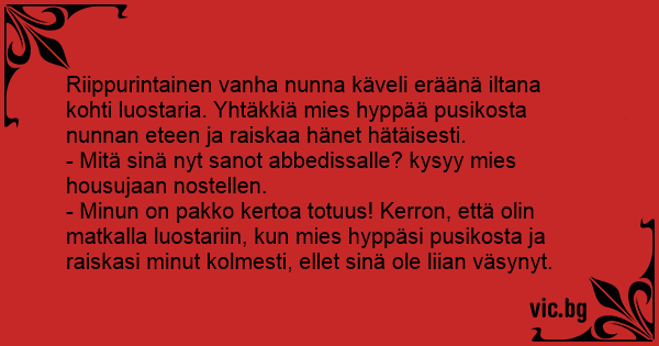 Riippurintainen vanha nunna käveli eräänä iltana kohti luostaria. Yhtäkkiä mies hyppää pusikosta nunnan eteen ja raiskaa hänet hätäisesti.