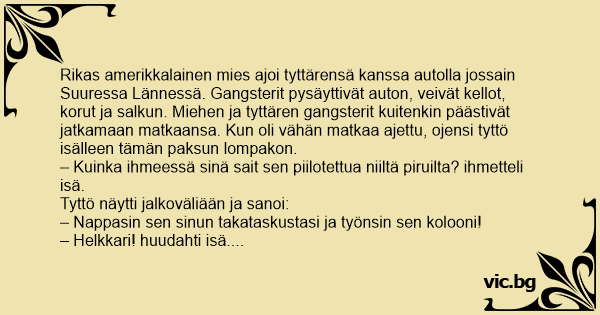 Rikas amerikkalainen mies ajoi tyttärensä kanssa autolla jossain Suuressa Lännessä. Gangsterit pysäyttivät auton, veivät kellot, korut ja salkun. Miehen ja tyttären gangsterit kuitenkin päästivät jatkamaan matkaansa. Kun oli vähän matkaa ajettu, ojensi tyttö isälleen tämän paksun lompakon.