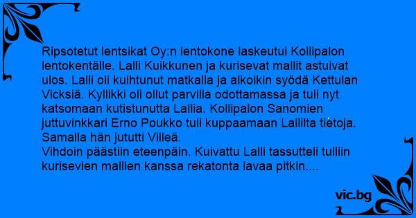 Ripsotetut lentsikat Oy:n lentokone laskeutui Kollipalon lentokentälle. Lalli Kuikkunen ja kurisevat mallit astuivat ulos. Lalli oli kuihtunut matkalla ja alkoikin syödä Kettulan Vicksiä. Kyllikki oli ollut parvilla odottamassa ja tuli nyt katsomaan kutistunutta Lallia. Kollipalon Sanomien juttuvinkkari Erno Poukko tuli kuppaamaan Lallilta tietoja. Samalla hän jututti Villeä.