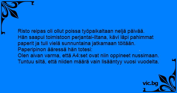 Risto reipas oli ollut poissa työpaikaltaan neljä päivää.