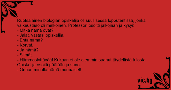 Ruotsalainen biologian opiskelija oli suullisessa lopputentissä, jonka vaikeustaso oli melkoinen. Professori osoitti jalkojaan ja kysyi: