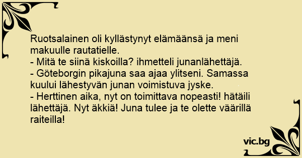 - Herttinen aika, nyt on toimittava nopeasti! hätäili lähettäjä. Nyt äkkiä! Juna tulee ja te olette väärillä raiteilla!