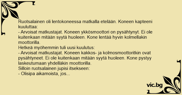 Ruotsalainen oli lentokoneessa matkalla etelään. Koneen kapteeni kuuluttaa: